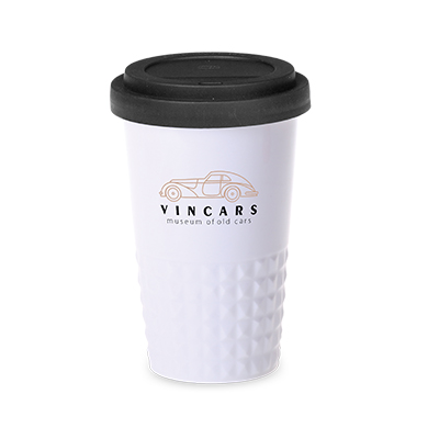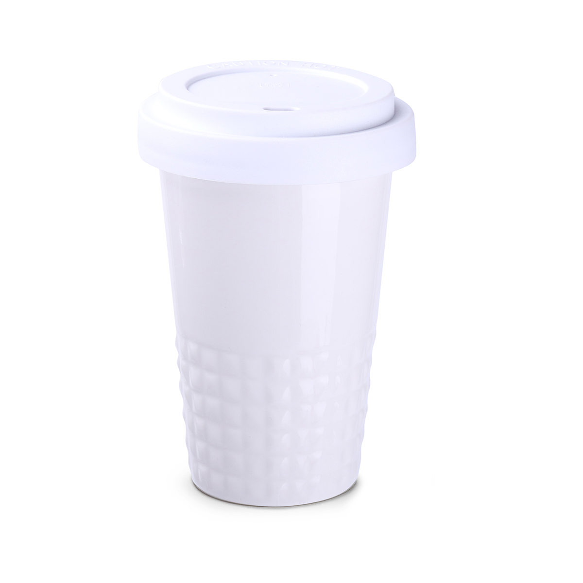 Finition subtile de la partie inférieure du mug avec ses formes sculpturales en pointe-de-diamant. Fermé par un couvercle, ce mug en porcelaine à double paroi offre une excellente isolation thermique.