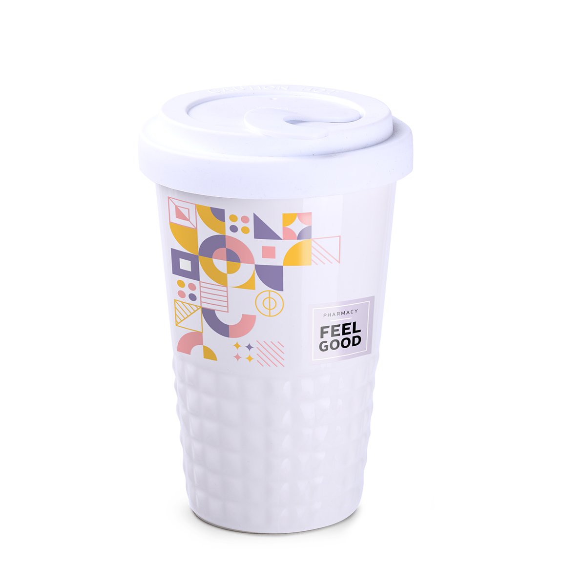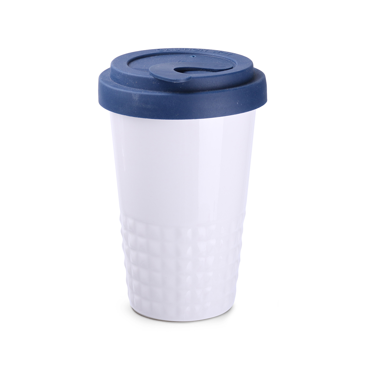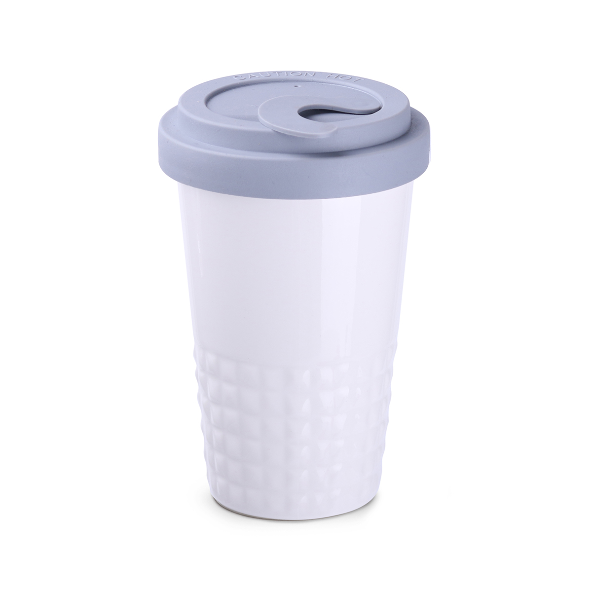 Finition subtile de la partie inférieure du mug avec ses formes sculpturales en pointe-de-diamant. Fermé par un couvercle, ce mug en porcelaine à double paroi offre une excellente isolation thermique.