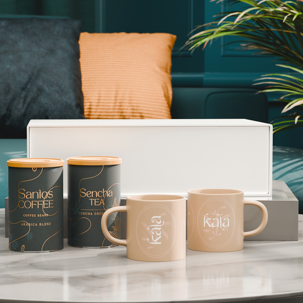 Un duo subtil de deux mugs Gaia aux couleurs naturelles et équilibrées, idéal pour mettre en valeur l’engagement en faveur de l’éthique et de l’écologie. L’ensemble est complété par un café sélectionné « Santos Coffee » et un thé aromatique « Sencha Tea », présentés dans d’élégantes boîtes. Le tout est emballé dans un coffret exclusif, blanc neige, avec fermeture magnétique.